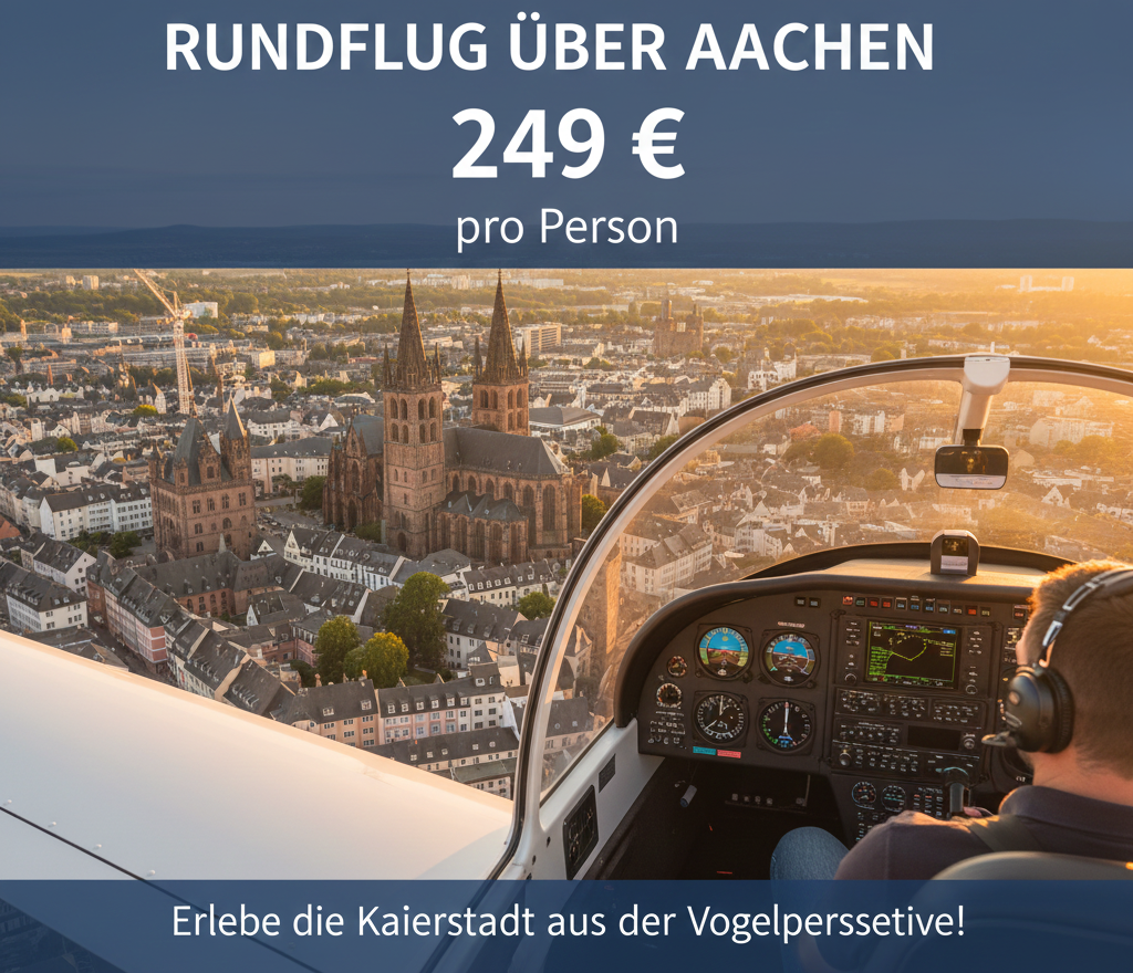 - Der individuelle Wunsch-Rundflug: Fliegen Sie eine Route Ihrer Wahl. Ihr erfahrener Pilot bringt Sie über Ihre persönlichen Wunschziele in Deutschland, wie Aachen, Stolberg, Monschau und die Eifel.